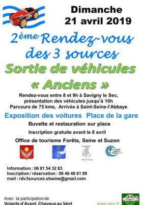 Ce dimanche 21 avril s'est déroulée la 2 ème balade des 3 sources, organisée par l'office de tourisme de Saint Seine l'Abbaye. Un très beau parcours réalisé par Gilbert Musy nous a permis de découvrir la région sous un soleil de printemps. VACV était partenaire de cette sortie ouverte à toutes les voitures et motos anciennes qui a regroupé une centaine de véhicules. 11 cabriolets de VACV étaient présents avec 19 personnes. La ballade de 75 kms environ nous a conduit à Saint Seine l'Abbaye ou un excellent repas nous attendait concocté par Marion , de la Ferme d'Etaules. Un remerciement tout particulier à Thierry et Nina Portier ainsi qu'aux bénevoles qui ont assuré l'organisation.